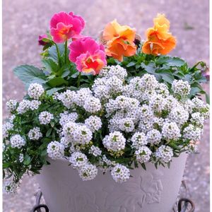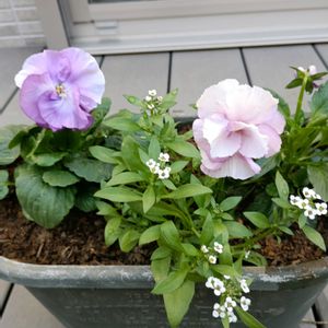 フリル咲きパンジーとアリッサムで寄せ植え作ってみました。 フリル咲きパンジーは初めて植えます。華やかな感じでとっても気に入りました(*'▽'*)