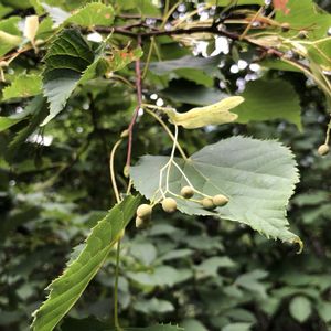 シナノキ(科の木) アオイ科 ハート型の葉が互生する。 花序の柄につくヘラ型の苞葉が、果実が熟すと翼の役目をして落ちる。
