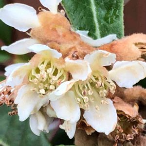 ご近所でビワのお花が咲いています。 私はいつも寒いからラクダの肌着を着ているの?って思ってしまいます。😆