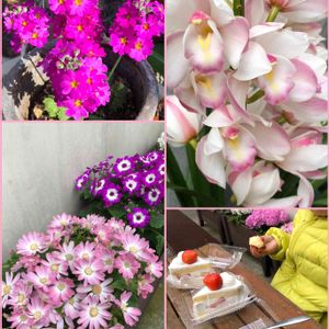 ケーキ屋さんにお花がいっぱい❣️ ここは工場なので作り立てで安くて美味しいです。 注文しようとしたら味見のチーズケーキ、マドレーヌを頂きとっても嬉しかったです。 持って帰るより外のテーブルで食べるのが好きなんです❣️ 美味しい!美味しい!って食べるので喜んでくれます。 凪翔も大喜び😄