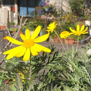 花友さんのユリオプスデージー❣️ 後ろの日よけのレトロ感が良い感じ! 昭和の匂いがします。