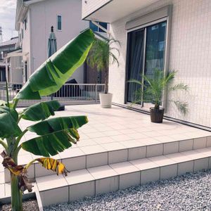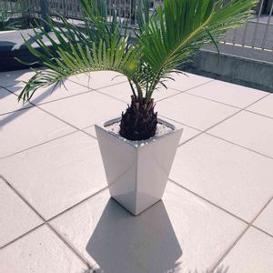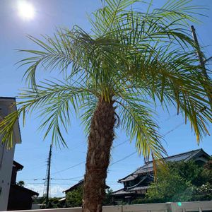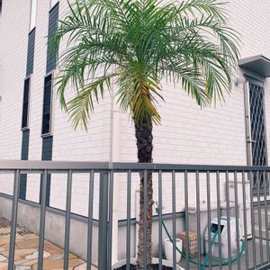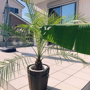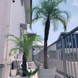 ウチのフェニックスロベレニー2号です! 幹にキズがあったり、根詰まりだったりとあまり良い状態ではなかったですが、形と大きさと安さで買ってしまいました🏝 先程まで新しい鉢に植え替え作業をしてました。 急なゲリラ豪雨に見舞われましたが、四苦八苦しながらも完了です! 移動させられる重さではないので、2号はこの位置で固定です。 問題は越冬です…笑