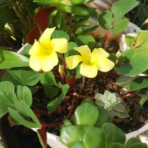 オギザリス✨ 枯れてしまったと思い多肉を一時植えしてたら😅芽が出て咲いていました✨おかげで雑な寄せ植え・・・😆