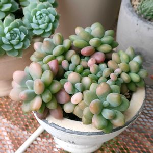 植え替えしたロココです 紅葉が残ったままの下葉、夏に高温障害で白くなった葉、新しく出て来た緑の葉 何だかカラフル🩷🤍💚 今年の夏は白くなってしまったつぶつぶちゃんが色々出ましたが、涼しくなってまた緑の葉が出て安心しました 元気に育って欲しいです 広い葉のムッチリさん ドライアントの優しい色も好みです