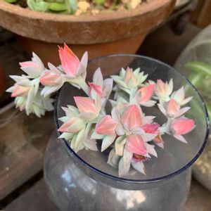 デカベリアその2。 表記はルシタだけど、一般的にはルシータって言うみたい。 ルンヨニーの一種。 エケベリアは種類がめちゃくちゃあってよくわからん。 薄葉で、脆い。 お迎え前から外葉はポキポキ折れてたけど、植え替えする時も折っちゃって、今はこの写真より小さくなっちゃってる💦 アークティックアイス同様、プレステラ105に植え替え。