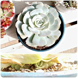 先日購入した大きいエケベリアの名前が違っていました💦 正しくは「ポルックス」、ポールックじゃなかったです(^_^;) ポルックスを大きい鉢に植え替え。 大きいから存在感が凄い😆 左斜め上のグリーンのルシータが外葉が枯れてちょっと小さくなってるのに今日気付いて 土の配合を保水性が高い花の土多めに変更して水もあげました。 ポルックスも同じく変更。 葉が薄い多肉は萎れやすいですね(> <;)