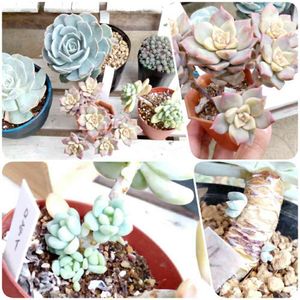 今日購入した多肉たち✨ 左上Pic 真ん中のルンヨニーとピンクの名無しさんがフラワーイベントで、右の2つ(セダムとロッティ)はホームセンターです。 イベントは2日目で行くのが遅かったから珍しいのは売れてしまってた気がします。 植木鉢もいつくか購入。 ルンヨニー大きいのに400円😁 左端に見切れているルシータは比較用に置きました。 ルシータとルンヨニーめっちゃ似てますね❣ ピンクの名無しさん凄い可愛い💕買う時に名前聞いたけど不明だそうです。 ロッティとルンヨニー子供が付いてて増えてくれそう🎵