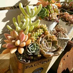 ネットでポチッた七福神✨ 他の大きいエケベリア達と一緒にパシャリ📷✨ 別の店で買った青くて徒長気味な七福神と一緒に大きい鉢に植えました🌼🌼🌼 超小さい七福神も居て根付いてくれるかな?