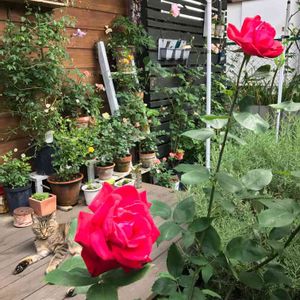 "赤いバラと猫" 4年前にホムセンで見切り品として売られていた300円の苗を購入。 名前も花も咲いていない状態だったので真っ赤なバラが咲いた時には目が点💦 まったく趣味とは違うバラ。 今では異彩を放ち、ポイントになってくれるこの赤いバラが大好きに❤️