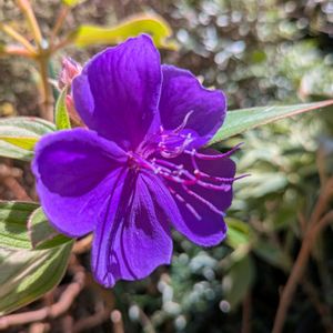 🌳木の花たち その306 シコンノボタン(紫紺野牡丹) 綺麗な鮮やかな紫色です。 シベの形が特徴的です。 一日花なのだそうです (*´︶`*) ✿ 草花だとばかり思っていましたが、 木の花でした。 しかも、 名前に和の雰囲気がありますが、 日本の裏側と言われるブラジル原産🇧🇷 南国のお花でした…(⊙ꇴ⊙) 🏷美しく青きドヨウ ✽.。.:*·゚ ✽.。.:*·゚ 🌳✨✽.。.:*·🍃゚ ✽.。.:*·゚ ⌘ メモ ⌘ 🔸科名・属名 ノボタン科 シコンノボタン属 🔸学名 Tibouchina urvilleana 🔸英名 princess flower purple glory tree lasiandra pleroma Brazilian glorybush glory bush 🔸別名 スパイダーフラワー ノボタン 🔸由来 ❇︎シコンノボタン(紫紺野牡丹) 野山に咲くボタンのように美しい花と名付けられた ノボタン(野牡丹)よりも濃い紫の花が咲くこと に因む。 🔸原産地 ブラジル 🔸花期 7月~11月 🔸花色 紫 ピンク 🔸特徴 熱帯植物。常緑低木。樹高1~3m。全体に軟毛が はえる。霜が降りない地域では葉は落葉するもの の戸外で冬越し可能。 葉は対生する単葉で長楕円形、5本の葉脈が目立つ。 全縁。 花は、花径7~10cmで茎先に円錐花序をつける。 5弁花。1日花。 雄しべは10個で長短があり、5個が長い。花糸の 先端に楕円形の付属体が2個並び、その先に大きく 湾曲した細長い葯がついている。 関節がある。 果実は蒴果。 鉢物として出回っている株は矮化剤によりコンパクト な姿になっているため、次の年には矮化剤の効果が 薄れて勢いよく成長するそうです。