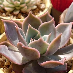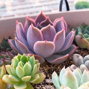 我が家では大きい方の多肉さん、暑くなるにつれ紫が増して来ました☺️ リラシナ入ってる顔ですね