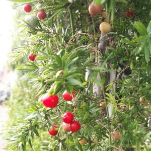 アスパラガス・スプレンゲリー ぽかぽかなおさんの投稿で、 よそのお宅のフェンスからはみ出してたのを思い出して 見に行ったら、緑色やった丸い実が、沢山赤くなってた💕 可愛い😍 よそのお宅のやけど、ワガコのように可愛い💕 もう、この配色だけでクリスマス〜(*´ A`*)ノ♡