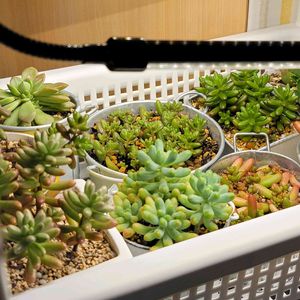虹の玉🌱 ばら撒きと葉挿しだとこんなにも成長速度と伸び方が違うんですね(、._. )、 多肉たちの徒長が気になる〜😭 おすすめのLEDライトありませんか?🥺