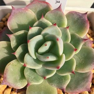 縁取りが赤い子、好きです♥️ この子は花芽に押されているのか、成長点が見えないような💦 とりあえず花芽は写真を撮った後に急いで切りましたが、この後どうなるんだろう❓(。・ω・。)