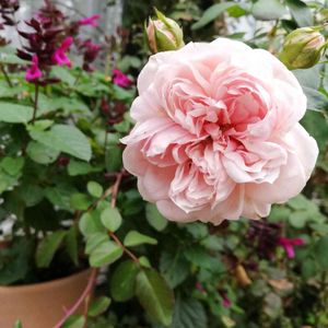 つるバラ シンデレラ 我が家にきて初めて花を見せてくれました!! 色はパールピンクまたはベビーピンクという感じで、思ったよりも小さく平べったい花… カップ咲きをイメージしていたのですが🤔 蕾たくさん持ってるので、これからかな☺️
