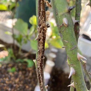 バラの長尺苗を通販で購入したら、細い枝に縦にバックリとした傷を発見。 古傷が破裂しただけっぽく見えたし大勢に影響ない枝なので、念のためどうすべきか(消毒対応か切り落とすか)問い合わせたら、謝罪と共に中に虫がいるからぶった切れとの指示が。 慌てて調べたら「サトクダマキモドキ」というキリギリスの親戚の仕業(産卵痕)らしい。 バラの本じゃ一度も見たことなかったから知らんかったわ…10cmほどの中から木くずが出てくる傷があったらカットが無難なようです。 またひとつ賢くなった、お店の方ご指摘ありがとうございました。いやー問いあわせて本当によかった、素人判断は危ないわ…