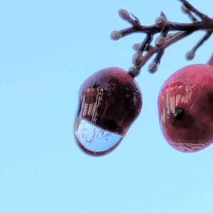 ナンテンの実に、雨粒が〜💧 垂れてる雨粒の中に、南天の枝葉が、 実に残ってる水分の中に、フェンスが映ってるのです。 こんな世界が好き🥰