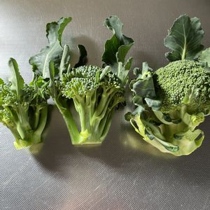 ブロッコリー(右側)と茎ブロッコリー(左側2個)を収穫しました。 最初の収穫、頂花蕾です。