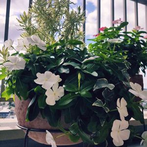 暑い日が続いて、日々草がまだまだ元気です。 這性の白い日々草が鉢を覆うように枝垂れていい感じに。お花より葉っぱがわさわさだけど、真夏より緑が少し濃くなって白いお花が引き立ってる気がします✨