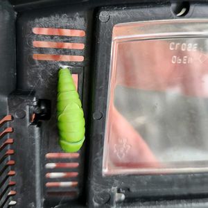 6日目のアオムシくん ゲ-ジの中で 一番身体が安定するところに 落ち着けました。 オシッコもうんちも いっぱい出しきって 本日から食べず飲まず 蛹になります。 ふたたび よみがえったら 揚羽蝶🦋だぞぅ~~~~