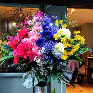 ~ 派手好きハッピーフライトの「どストライク🎯」です ~ 先ほどコンビニへコーヒーを買いに行ったらいつも会社の受付台にアレンジメントを飾ってくださるお花屋さんの前にこれから配達すると思われる2段のスタンド花が置いてありました✨ なかなか派手な色使いで派手好きなハッピーフライトには「どストライク🎯」のスタンド花でした🤩 最近ちょっと残念なことに昨年大量に贈られた胡蝶蘭がまだ頑張って咲いて受付台に鎮座しているのでこのお花屋さんにフラワーアレンジメントの注文を中止してるようなんです😂 そろそろ毎週楽しみの受付台のフラワーアレンジメントを復活して欲しいわ〜😅