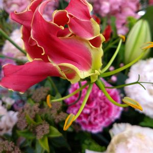 2/26 (水) ☆。.:*・゜✨ ①〜③💐開店祝いスタンド花💐〜 ①グロリオサ 学名❀✿Gloriosa 和名❀✿キツネユリ(狐百合) その他の名前❀✿ユリグルマ(百合車) ※イヌサフラン科 ※キツネユリ属(グロリオサ属) 2/26付📷📱💕スタンド花💐💐💐