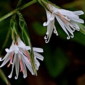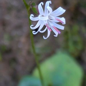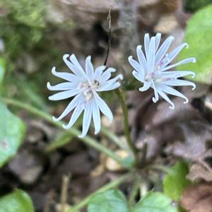 キッコウハグマ(亀甲白熊) キク科 モミジハグマ属 本州〜九州の山地のやや乾いた木陰に生える 茎は高さ10〜30cm 在来種 名前の由来は葉の形が亀の甲羅に似ていることと、花がヤク(チベットの白毛の家畜牛)の尾の毛で作られた飾りのハグマ(白熊)に似ている事 日本とチベットの合体した名前が面白いです しろくまと書いてハグマと呼ぶのも変わっていますね 1️⃣頭花は3個の小花からなり、長さは約9mm 花冠は白色で5個に深く裂ける 花弁の先は右に曲がる 小花は閉鎖花を結ぶ事が多い 2️⃣ 花は実物の大きさです 葉は茎の下部に5〜11個集まってつき、長い柄がある 形は心形で長さは1〜3cm キッコウハグマを見る為に訪れ、丁度自然観察会で行くと言うことを教えてもらい、自分では見つからない場所に案内をしてもらいラッキーでした コウヤボウキのようなイメージでしたが、思ったよりも小さなお花でした お花は全部で4輪だけでした