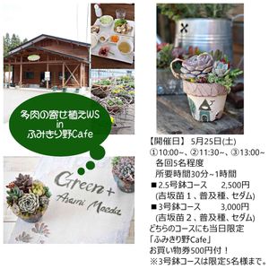 前postの画像日程間違えていますので再度💦 GSコメでも受付可能です👌 : 💡受付開始💡 5月25日多肉の寄せ植えWS分 コメント欄へ申込。 ①ご希望の時間帯(第1希望、第2希望、第3希望の順で)と参加人数。 ②3号コース希望の方のみご記入。 先着順に漏れた場合と記入ない場合は2.5号コースになります。 : ◾️5月25日(土)北秋田市 ふみきり野Cafe: : ◾️10:00〜残2 11:30〜残2 13:00〜残2 各回5名程度 所要時間30分〜1時間: : ◾️2.5号鉢コース 2,500円 ( #吉坂包装 苗 1、普及種、セダム) ◾️3号鉢コース 3,000円 (吉坂苗 2、普及種、セダム) ※3号鉢コースは限定5名まで!残3 : : どちらのコースもWS限定リメ鉢使用。 当日限定『ふみきり野Cafeお買い物券500円付』: : 当日参加枠も多少はご用意しますが、材料なくなり次第終了しますので、ご予約をお勧め致します。: : : ◆予定◆ 5/18.19 ガーデン&マーケットin秋田 出店 5/25 ふみきり野café WS 6/2 カフェ亭いーな 出店 6/22 ふみきり野café WS 6/25 大潟村公民館 多肉寄せ植えWS 6/28 市内こども園 多肉寄せ植えWS 7/14 花のある暮らし 出店