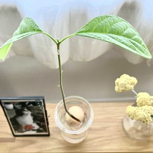 アボカド🥑の 水栽培の記録 ・やったあ 2週間経ちました こんなに成長しました🤗 嬉しい😊 ・割れ目から 茎も根も伸びて… ・葉が3枚 良く見ると4枚目と5枚目も出て きてますねー 茎の横からの小さなのも葉かな 葉が出てくるまで育ったのは初めてなので、嬉しい😃 後2週間は、このまま見守っていきます 11月になったら、鉢に植えようって思いますが…