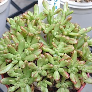 いろいろと乱れていたので、今春も植え替えとか切って挿し木しないとヤバいっぽい。😅 ベランダが狭くて、決まった向きからしか見られないので、茎が倒れるとそれが徒長しているのに気付きにくい。(今特に桜吹雪が危険水域。自重で千切れるかも。あっ、花の咲いた樹氷もヤバヤバ!オウレイは茎が太いから大丈夫かも?かも?😅) こんなに徒長するからには、やはりこの場所では光量不足だ。 ペットボトルを加工してタワー型の植木鉢にして、物干し竿から吊り下げようと思っているのだが、 その物干し竿に吊り下げると、上手くいけばアサガオとフーセンカズラのグリーンカーテンの陰になるので、 多肉植物にはかえって光量不足になるのかも。 いや、グリーンカーテンは真夏と残暑の時期しか葉を広げないので、多肉植物の真夏の日除けになって良いかも。 まあ、そもそも雑な種蒔きをしたので、アサガオもフーセンカズラも発芽しないかもしれないけど。😅 で、ペットボトルの加工なのだが、重さと見た目の愛らしさとたくさんの種類を1箇所に縦型にまとめたいので、 縦長の胴体部分を利用するよりも、口側部分を使いたい。 しかし、口側部分も、注ぎ口が長いタイプだと土の量が少ないので、①注ぎ口の短いタイプで、花?部分を大きくしたいので②直径が大きいタイプを使いたい。🤔 そうすると、うちに幾つも溜めてある調味料やワインのペットボトルだとイマイチ条件に合わない。 私が歩ける範囲で手に入る物では、コカコーラの2Lペットボトルがベストなのだが、 コーラは嫌いではないが、甘い飲み物は始めると止まらなくなりそうでヤバいのである。😅 他に手をつける前に心配しているのは、 ペットボトルの口側部分は単体では立たないので、 一度植え替えると、冬季に室内に取り込もうと気が変わっても(うちのカーテンレールはステンレスではなくて弱々なので) なかなか難しくなる。 それ以前に、以前加工した時、100均で得たスチールワイヤ(直径2mm)を思った通りに曲げるのは、私の握力では難しい事が分かっている。 上手に丸く曲げられないと、逆にペットボトルに開けるワイヤを通す穴(重さを分散してペットボトルが歪むのを避ける為に縦に2つ開けたい)の位置が重要になる。 でも、これも歳なんだなぁ、手が震えて熱いハンダゴテを上手に扱えないという事も分かっている。 …以上、頭良過ぎて()失敗する未来ばかり見えてなかなか動けませんという、ひと様にはどーでも良いグダグダでっす。😁 あっ、名札を確認していたら、センペルビウムがコナカイガラムシだらけだっ!😱 爪楊枝の出番だ!