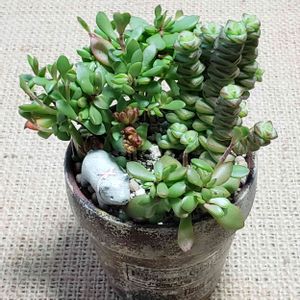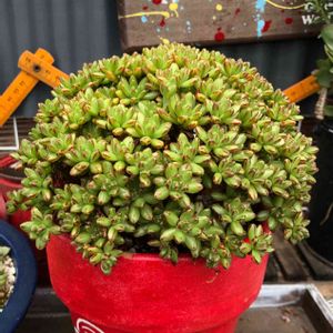 今年は多肉達を雪が降ろうがベランダで冬越しさせた為、小人の祭りは殆ど枯れました。かろうじて生きてた枝を一本挿し木して育てる事に。根が出たので先日セリアで購入したミニ鉢に植えてみたらちょうどいい感じ🌱 セメント鉢ですが、自分でちょっと着色しています。