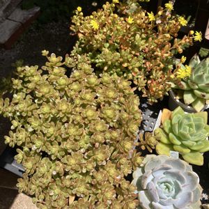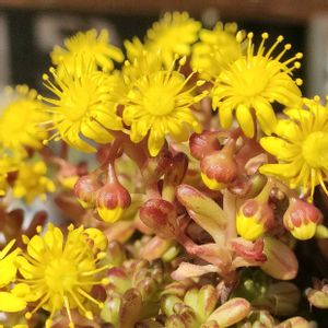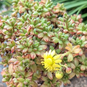おはようございます☁ 日光たっぷり浴び 可愛く小さい多肉質な葉 黄色い お花が咲きました