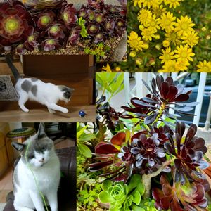 ↖️地植えカシミアバイオレット💐ブーケの様❣️ ↘️雨晒しアエオ寄せ植え ↗️小人の祭り🌼この後お花✂️ 🏷ニャンニャン祭り ネズミ玩具で遊んだのは最初の1回だけ~💧 &オブス顔😹