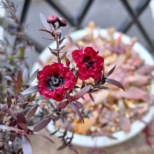 "マヌカハニーの木“とありタグの付け間違いと思いましたが、 🔍️たら一重の白い花が原種で🍯をとり、これは真っ赤な八重の和名"御柳梅“でした😊 1️⃣ 御柳梅アップ 2️⃣ 秀麗アップ 3️⃣ 全体