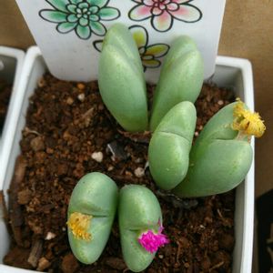またもや コノフィツム花笠美人 枯れてしまったものの黄色い花とピンクの花が👀✨ この黄色とピンクの花が咲いた2ペアはもともと1つのコノから分裂してるハズ。 なのに違う色の花が咲くの? 不思議~