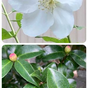 ☆庭のお花達☆ ↑バイカウツギ この時期、又枝先に一輪🤔 普通6月から7月頃に咲く お花なのに異常ですねー 爽やかな白色は、いつもきれい😍 ↓サザンカの蕾がピンク色に 色付き始め、賑やかです〜 開花すると一部ピンク色が 殆ど白色に変化します〜