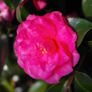 朝日がよく当たるお向かいのサザンカ八重咲きが咲き出しました。 お向かいの花がいっぱい咲き、散り出す頃にウチのサザンカが咲き出します。