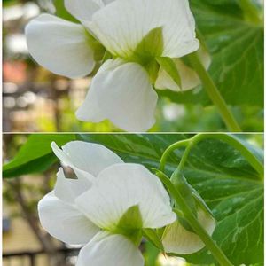 スナップエンドウの花🤍💚 白くてかわいいな💕 カットしてお部屋に飾ろ〜っと🥰 なんつって🙃