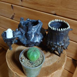キタキタドロドロ鉢‼️ 抽選販売当たりましてん🥰 作家【林田ドロロウ】さんの どろどろした世界観がたまりません🤩 右 泥棘黒野槌鉢 左 試作品でオマケのスチームパンク+どろどろ 布かぶりちゃん💚 何を合わそうか妄想が止まりません💚 置いてあるのは シンメトリカのフォエチダ添え💚
