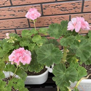 💕淡いピンク、我が家の花 💕 ⑴⑵ ペラルゴニウム系 テンジクアオイ 香りがある ⑶⑷ ヤグルマギクのピンク 雨のせいで横倒しで曲がって咲いてます ⑸ ラミウム・マクラツム (オドリコソウ) ピーコンシルバーの葉っぱ ドンヨリ( ب_ب )☁️空 少しでも明るい気分に🎶 そして 涼し気になりますように☆。.:*・゜