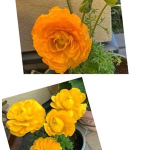 ラナンキュラス💞💞💞 いとこからの花便り💞💞 1輪から 三週間たって満開の便りが届きました💞💞💞 色が違って見えますが同じ鉢です💞 二枚目 うちのフローズンパンジーと薔薇蕾 解凍しました✨ 薔薇ちゃんいつ咲くかな?