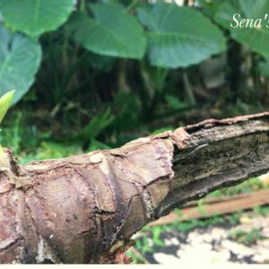 きのこパパ「クワズイモ...デカっ!😳」 Sena 「あはは...。うちでは普通ですよ。」 きのこパパ「ティーリーフも背が高いですね。」 きーくん「ハ、ハ、ハックション!🤧」 Sena 「あら!きーくん、風邪ひいたら大変! 今日は、寒いから中へどうぞ...。」