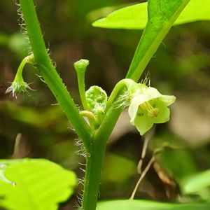 見た事の無い淡クリーム色の可愛いお花に会いました、調べてみたらばイガホオズキのようです♡🌿 イガホオズキは山地の林内に稀に生え、多くの地方で絶滅危惧種Ⅱに指定されています。 葉は2~13cm位の卵形〜広卵形で2~4cm位の柄があります。 花は葉腋から下向きに花を咲かせます。 花冠は広鐘型で直径5mm位、先は浅く5裂し、外面に短毛があります。 萼は鐘型で太い軟毛が生え、花の咲いた後で先の開いた球形となって液果を包みます。 液果は緑色で刺状の突起があり、1cm位で熟すと白くなり多数の種が入っています。 ナス科イガホオズキ属 (松江の花図鑑より) 3️⃣ イガホオズキの果実 5️⃣ 昨年の秋に3号路で見た同じナス科の赤いハダカホオズキの実