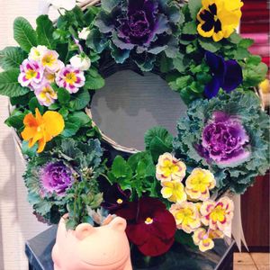 パンジー&ポリアン&葉牡丹の 寄せ植えリース✨ 多肉ちゃんを背負った🐸君と一緒にパチリ📸