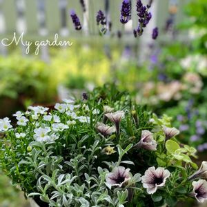 おはようございます^ ^ 寄せ植え2つ作りました💜🤍💚 ①イングリッシュラベンダー🪻 ペチュニア ティー アレナリア ブリザードコンパクト シルバーリーフ ヘリクリサム これに似た寄せ植えを作ったことあるなぁと思いましたが、やっぱり好きな花は変わらないですね🤗 今年はライムグリーンのヘリクリサムをアクセントに入れてみました💚 ⓶デルフィニウム♡ ペチュニア ムーンライト💚💜 タイム♡ ヘリクリサム をサルビア ガラニチカだけ残っていた鉢に植えました。 ペチュニア ムーンライトのライムグリーンにあわせてヘリクリサムを植えました💚 ヘリクリサムは株分けして両方に🍃