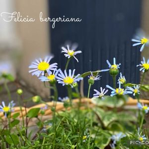 おはようございます^ ^ 籠寄せのキングフィッシャーデージー💙🍃 別名フェリシア ベルゲリアナ 1センチくらいの小さなお花です。 細い茎が風に揺れて、、小花好きにはたまりせん🥰