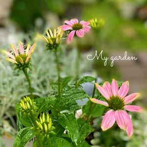 おはようございます^ ^ 2年目のエキナセア🌸🍃 2枚目が去年のpicです。 今年は去年と違う色みたいです😅 サーモンピンクも可愛い💕 去年は小さな苗でお迎えしたので3つしか花が咲かなかったけど、今年はたくさん咲いてくれそうで嬉しいです♡^ ^♡♪