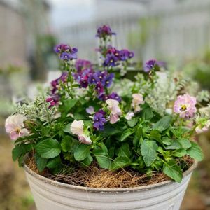 おはようございます^ ^ パンジーきもの*の寄せ植え🤍💜 籠型の青いプラ鉢に寄せました♡ リーフを入れたりしてみましたが、これはシンプルに2つだけが1番素敵💕 モリモリになったら可愛いだろうなぁ♡^ ^♡