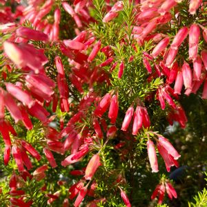 【エリカ】《ツツジ科》 「クリスマスパレード」 花言葉 「博愛」「幸運」「孤独」「心地よい」 「謙」 別名 エリカ ヒエマリス エリカ・クリスマスパレードは南アフリカ原産での常緑低木です。 荒地に自生するこの仲間は荒野を意味する「ヒース(Heath)」という名でまとめられ、その最も大きなグループがエリカ属です。 日本には大正時代に多くの種類が輸入され、種類や品種によって春咲き、夏咲き、冬咲き不定期咲きがあり、ほとんど周年店頭に並んでいます。 交雑品種のクリスマスパレードは冬咲きで、長さ約3㎝、淡い紅色の細長い筒状花を咲かせます。