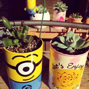 初代リメ缶じょーろ、何度目の仕立て直しかなぁ… 昨日から娘が小物やら多肉寄せとか持ち出して… どうやら、卒業制作展の作品である壁掛け棚ができたようで、その撮影のために使っている様子… 持って行ったトマト缶のリメカン寄せ植えが少し背が高かったようで、助け船を出してやりました、これなら高さいけるんじゃない?…でもほったらかしだったのでちょっと空間ができてしまってました😅 ので…、急遽仕立て直し 笑 ドルフィンネックレスの先っぽには花芽がついておりました😊
